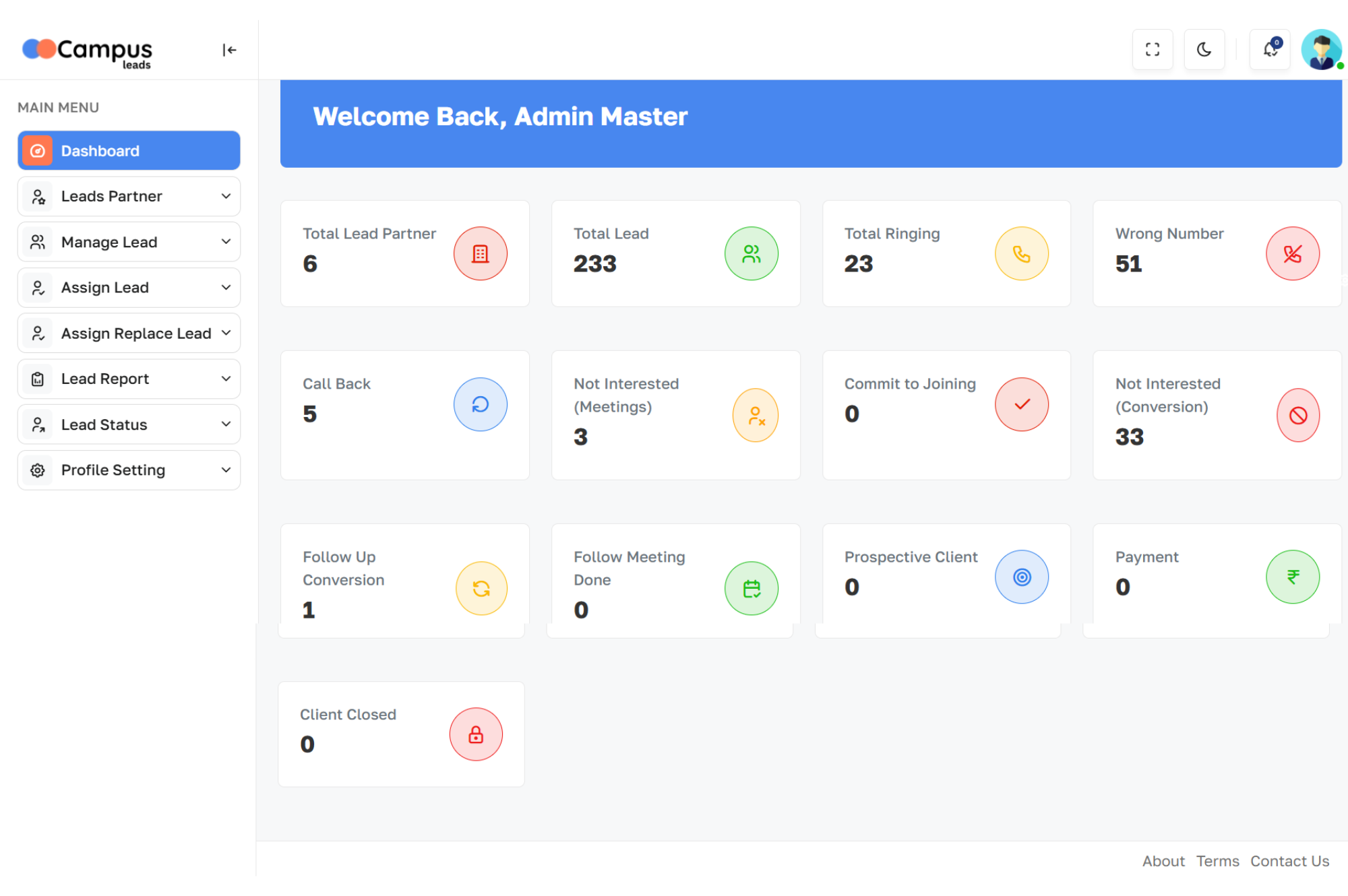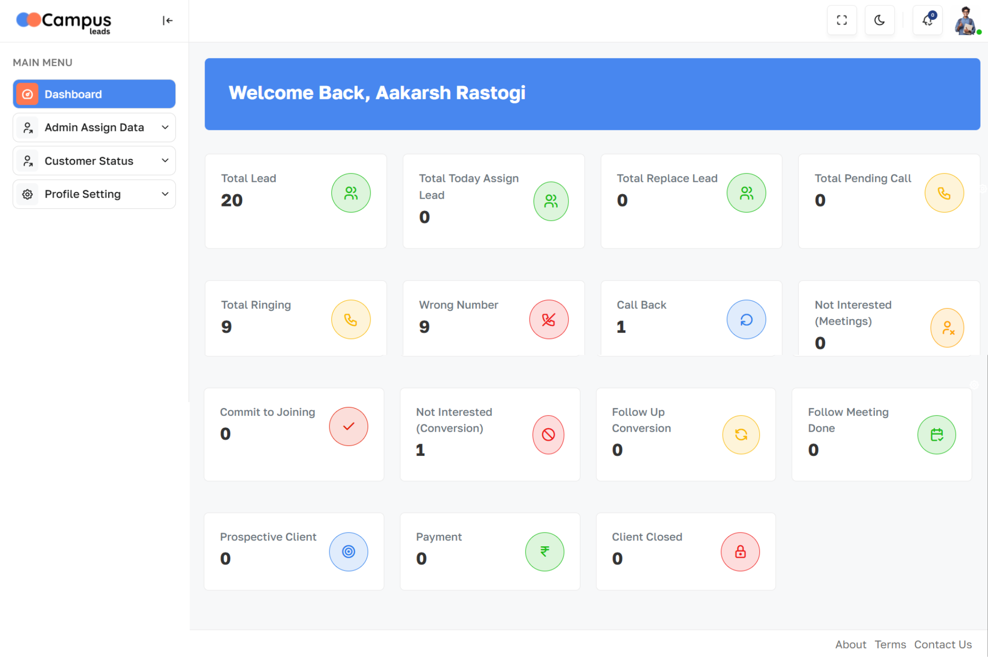 This CRM is specially designed for education counsellors, admission consultants, and online education teams who want complete control over their leads, team performance, and daily workflow. The CRM will be installed directly on your own domain & hosting so your data stays secure, private, and trusted.